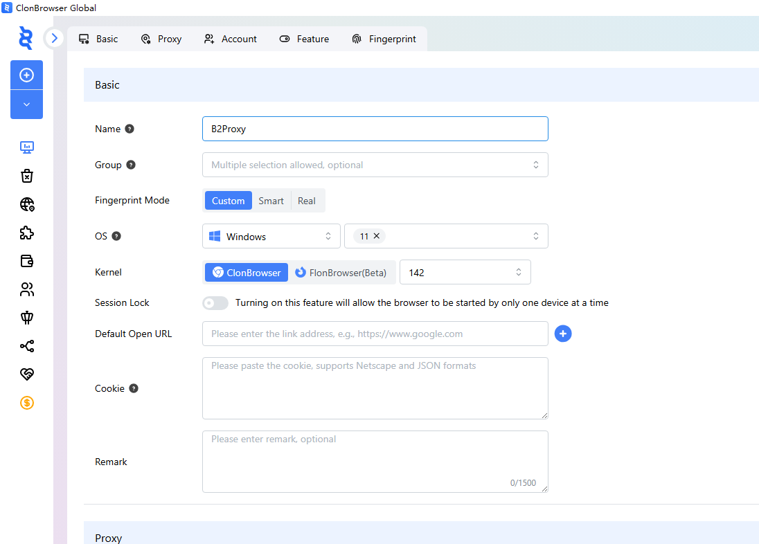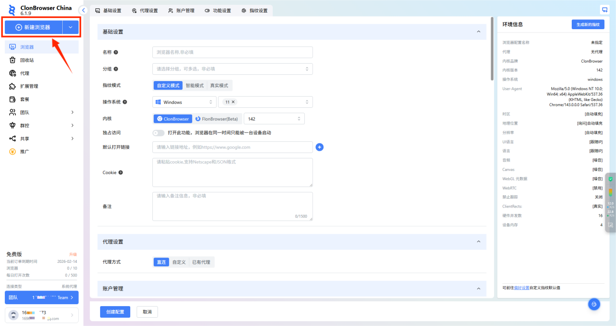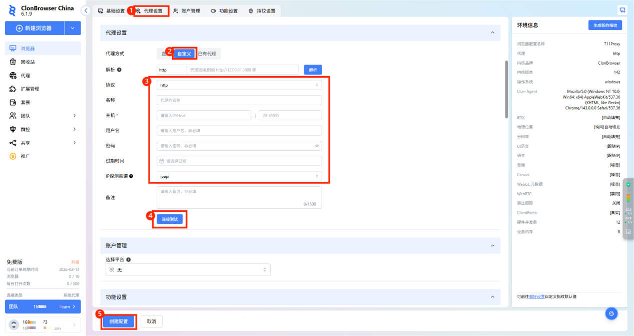 3.3 内核可选Chromium(即ClonBrowser)内核、Firefox(即FlonBrowser)内核及内核版本,默认内核版本是126。国家/ 地区可根据您所使用的IP所在国家地区选择